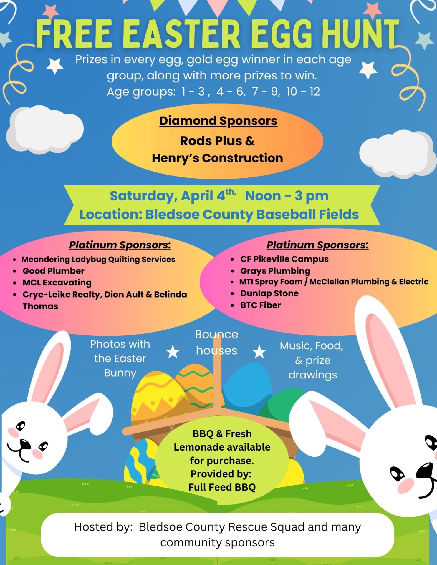 Easter Egg Hunt Saturday April 4th, 2026 Noon - 3 pm Egg Hunt, Easter Bunny, Bounce Houses, Food and Prizes! |