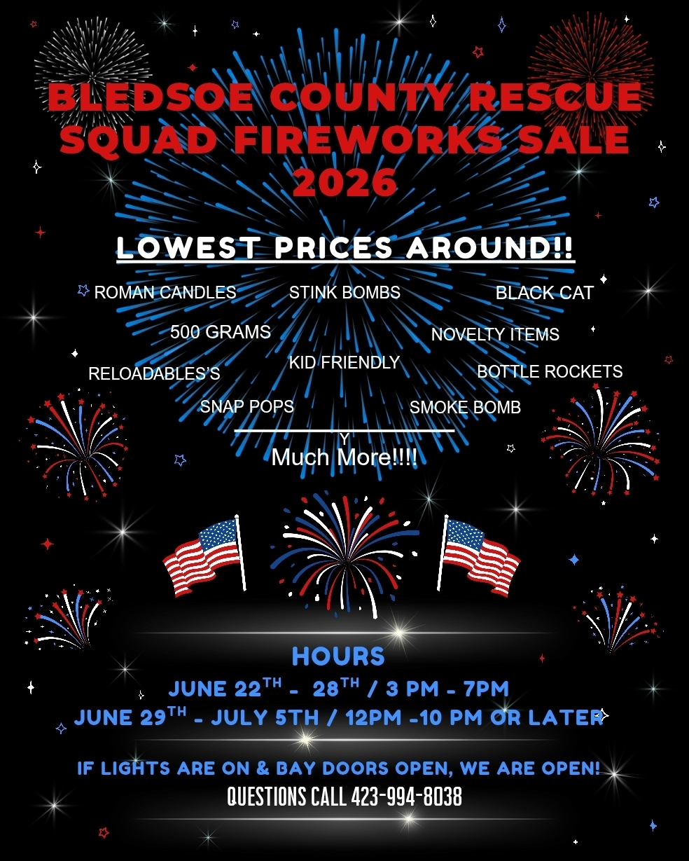 Lowest prices in town!! Come get you Fireworks at the Bledsoe County Rescue Squad Times will vary. If Bay door are open we are open! |